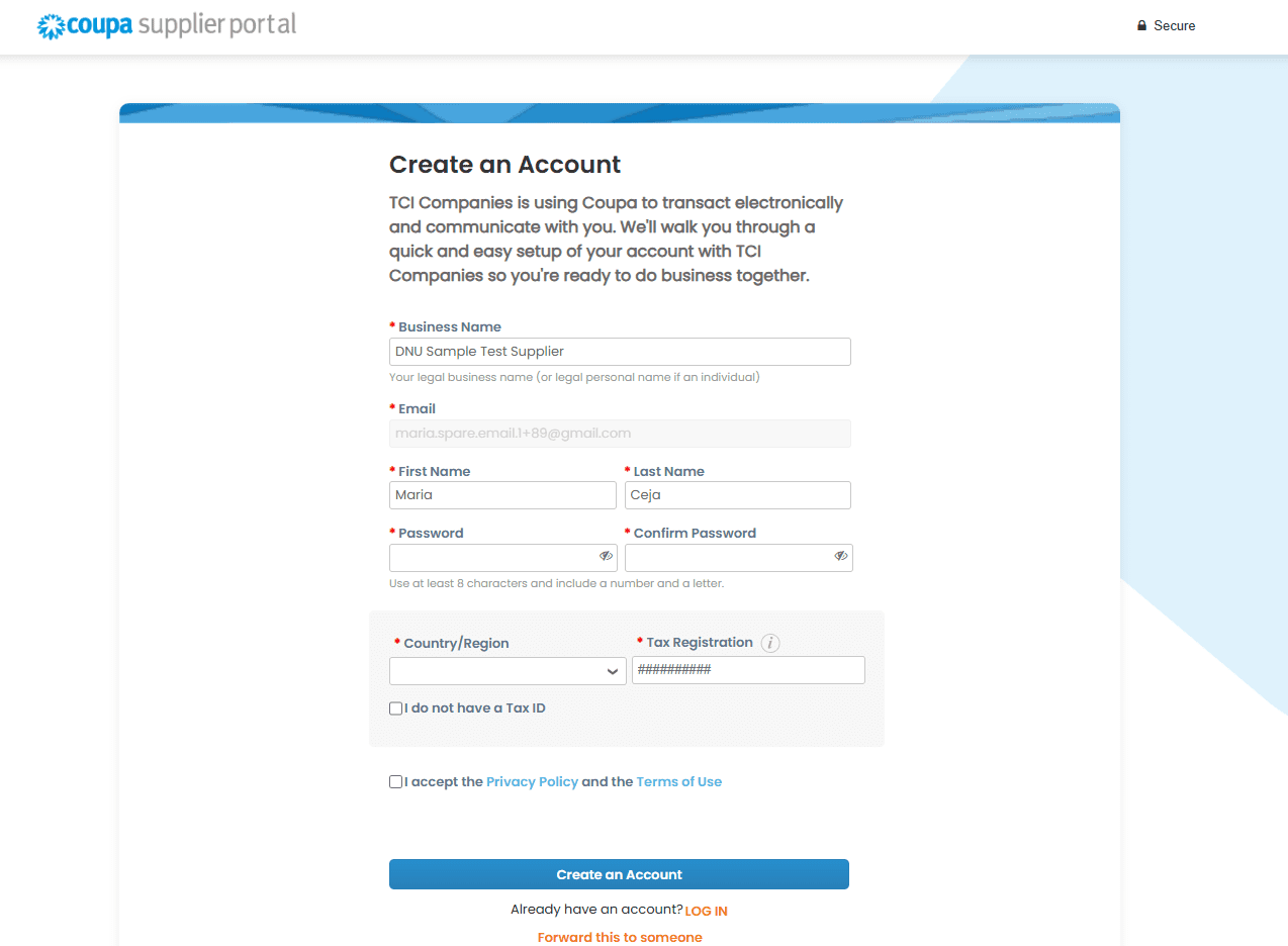 - Provide Additional Details: Complete the Country/Region and Tax Registration section.